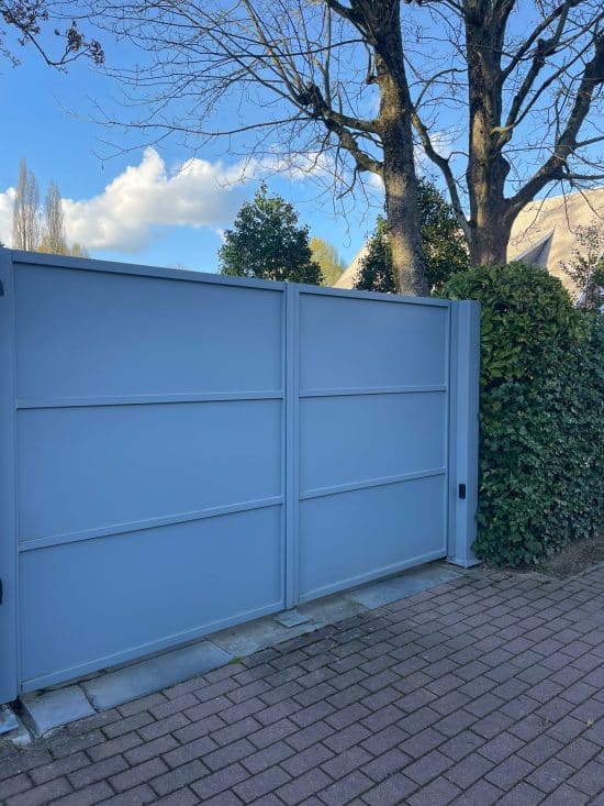 De Parisian-poort valt op door zijn moderne en uitgesproken design – ideaal voor wie op zoek is naar een stijlvolle én functionele toegang. Met zijn dikke horizontale lamellen en subtiele openingen biedt hij de perfecte balans tussen esthetiek, lichtinval en privacy.